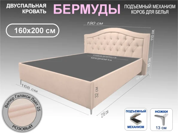 Кровать Бермуды, 160×200, Подъемный механизм полное дно с полкой, Велюр Галакси лайт 25-светло розовый, Ножки 13 см угловые хром Чехол на царгах НЕ съемный,.