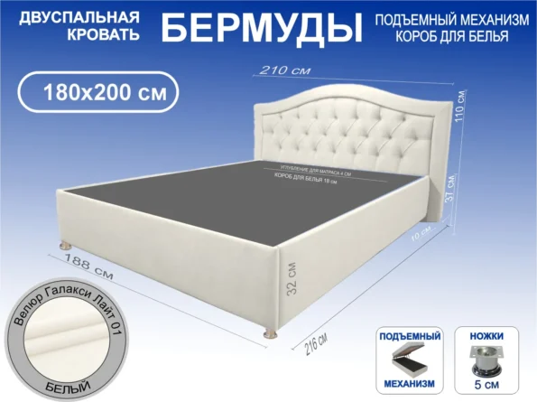 В наличии Кровать Бермуды, 180×200, Подъемный механизм полное дно с полкой, Велюр Галакси лайт 01-белый (молочный оттенок), Ножки 5 см стандарт Чехол на царгах НЕ съемный.