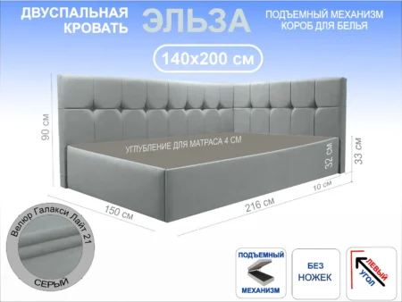 Кровать Эльза, 140×200, с подъемным механизмом полное дно с полкой, Велюр Галакси лайт 21-серый, без ножек, Угол Левый — длинное изголовье слева Чехол на царгах НЕ съемный
