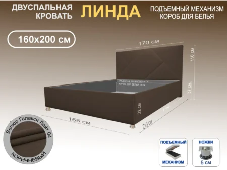 Кровать Линда, 160×200, с подъемным механизмом полное дно с полкой, Велюр Граунд 3-коричневый, Ножки 5 см стандарт